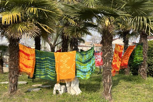 授课期间,残疾学员们拿着材料,仔细聆听高平老师讲解扎染工艺的基本知识、扎染特点及制作技巧,大家都按捺不住激动的心情跃跃欲试。不少好学的残疾朋友向老师提问请教,老师都手把手一一指点,现场气氛热烈。学员们充分发挥自己的想象力,用橡皮筋在染布上扎出了各种形状,染布经过浸染,呈现出各种美丽、独一无二的杰作,给我们的心灵也带来一抹亮色。