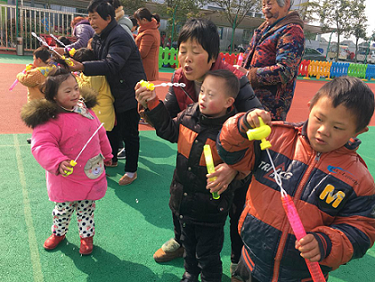 哇,我们的小朋友不仅载歌载舞,而且还有精彩的户外活动,乘着和煦的春风我们一起吹起了泡泡,在幸福的阳光下我们来比赛谁吹的泡泡最多吧,你看那个小迷妹对她的小男神简直是崇拜不已。