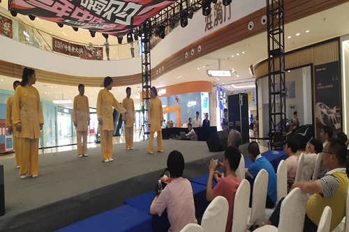 本次活动在商场分两个方阵同时进行:一个方阵是巾帼志愿者现场为残疾人包爱心粽,社区将提前准备好的糯米、腊肉、红豆 、蜜枣、粽叶、调和油、盐、等食材摆放好。大家围在一起,志愿者们舞动着双手,包出自己拿手的绝活。不一会,一个个绿色水灵的粽子便整整齐齐的摆放在了大家的眼前,社区书记与志愿者们将包好的粽子一份份送给残疾人朋友们。第二个方阵是来自社区的文艺团体以及幼儿园的小朋友们共同献上了一场精心组织的“艺术大餐”,既有刚柔并济的《陈式太极拳56式》太极拳表演,又有可爱的小朋友带来的《小脚丫》舞蹈,一段《没有共产党就没有新中国》柔力球表演更是将演出现场的气氛推向一个新的高潮,受到了残疾人观众的欢迎和好评。