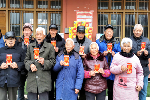 王绪国先生代表王兆春、文彩霞夫妇,对家乡敬老院和托养所的80多位孤残老人进行了亲切的慰问,并祝大家新年快乐!健康长寿!又向每位孤残人士发放了100元的慰问金及牛奶、饼干等礼品,以帮助他们度过一个难忘而又愉快的春节。孤残老人们接过红包和礼品,热泪盈眶,深受感动。8旬老人陈启英逢人便夸,王兆春、文彩霞夫妇致富后,始终心牵家乡,情系我们孤寡、残障老人,年年都给我们送来春节大红包,对我们关爱有加,使我们倍感幸福,我们深深地祝福他们,谢谢他们啦!他们不愧为名副其实的乡贤,他们的爱心善举,令我们终身难忘!