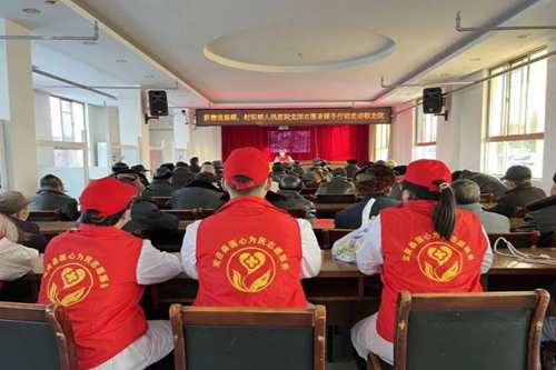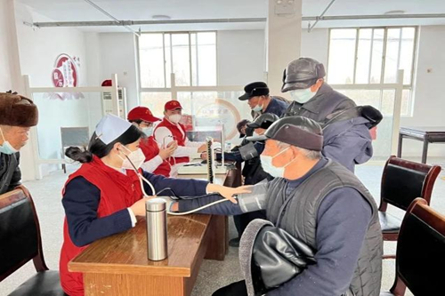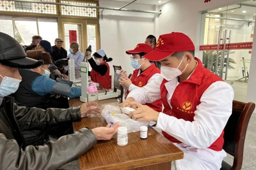 志愿者们耐心的为老人们测量血压、血糖,并指导他们进行合理用药,同时告知日常生活中的一系列注意事项。