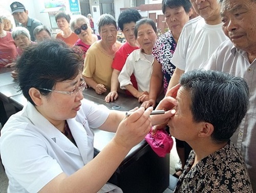 活动现场葛秀华医师耐心地为前来咨询的居民解答有关视力障碍预防知识,并为他们进行眼部检查。
